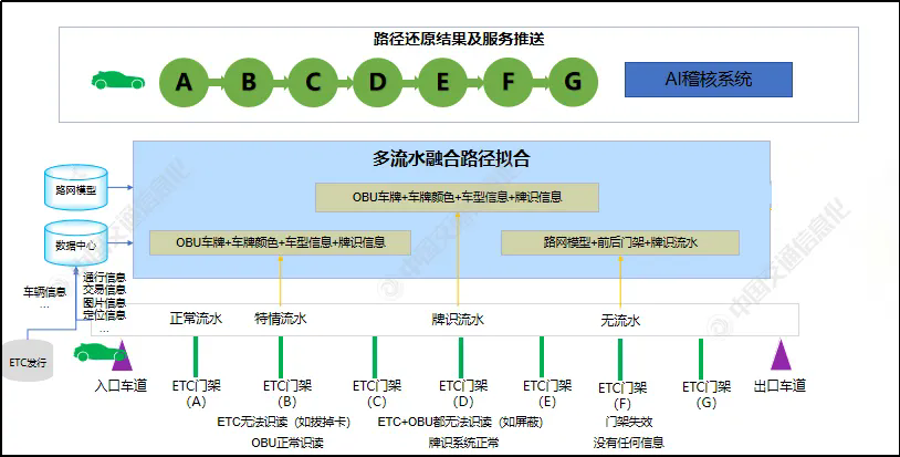 本文針對(duì)ETC識(shí)讀率低、牌識(shí)流水與抓拍率低、假冒減免車輛、套牌、路徑作弊等收費(fèi)問題,搭建了AI稽核系統(tǒng)平臺(tái),實(shí)現(xiàn)了多源異構(gòu)數(shù)據(jù)的采集、存儲(chǔ)、處理與分析。在深度融合ETC門架、收費(fèi)站等流水和圖像信息的基礎(chǔ)上,提出了多流水融合路徑擬合方法真實(shí)還原了通行過程車輛信息,為偷逃漏通行費(fèi)稽核提供了完整證據(jù)鏈。同時(shí),深度分析了所轄區(qū)域2020年5月至2021年12月間數(shù)據(jù),結(jié)果表明,AI稽核系統(tǒng)模型準(zhǔn)確率較高,可有效防范和遏制偷逃漏通行費(fèi)行為,提升稽核追繳成功率。