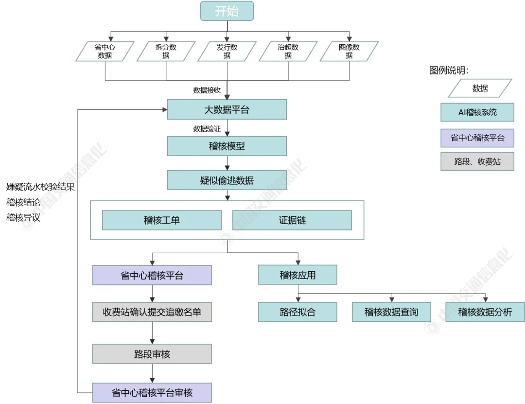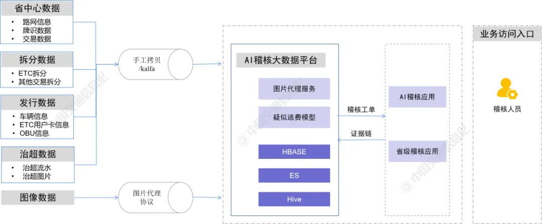 同時(shí),鑒于數(shù)據(jù)存儲(chǔ)介質(zhì)、數(shù)據(jù)存儲(chǔ)類型和數(shù)據(jù)傳輸方式的差異,通過不同工具實(shí)現(xiàn)異源、異構(gòu)數(shù)據(jù)的導(dǎo)入。其中,對(duì)實(shí)時(shí)性要求較高的監(jiān)測(cè)數(shù)據(jù)以分布式消息隊(duì)列的形式由Kafka分發(fā);關(guān)系型數(shù)據(jù)庫由Sqoop等工具直接將數(shù)據(jù)導(dǎo)入HDFS;非實(shí)時(shí)性數(shù)據(jù)選擇MapReduce計(jì)算引擎,實(shí)時(shí)性要求較高的數(shù)據(jù)選擇Spark或Storm計(jì)算框架。3、AI稽核系統(tǒng)流程AI稽核系統(tǒng)流程如圖4所示,可分為4個(gè)步驟:(1)省中心數(shù)據(jù)、拆分?jǐn)?shù)據(jù)、治超數(shù)據(jù)、發(fā)行數(shù)據(jù)等接收匯聚至大數(shù)據(jù)平臺(tái),通過稽核模型數(shù)據(jù)驗(yàn)證,得到疑似偷逃費(fèi)數(shù)據(jù);(2)系統(tǒng)根據(jù)疑似偷逃費(fèi)數(shù)據(jù),自動(dòng)匹配生成稽核工單和證據(jù)鏈,并推送至省中心稽核平臺(tái)及稽核應(yīng)用;(3)省中心稽核平臺(tái)將稽核工單和證據(jù)鏈推送至收費(fèi)站,一線稽核人員確認(rèn)后提交追繳工單,工單提交至路段和省中心進(jìn)行審核;(4)省中心稽核平臺(tái)審核完畢后,生成追繳名單,并反饋校驗(yàn)結(jié)果、稽核結(jié)論等至AI稽核系統(tǒng)。
