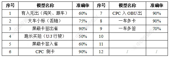 (四)稽核模型建立與準(zhǔn)確率驗(yàn)證本文所述AI稽核系統(tǒng)根據(jù)不同逃費(fèi)類型建立對(duì)應(yīng)模型,目前已實(shí)現(xiàn)大車小標(biāo)、有入無出、屏蔽卡簽入省、屏蔽卡簽出省、跑長買短、CPC倒卡、CPC入OBU出、一車多卡、一車多簽等近10種偷逃費(fèi)行為稽核。以大車小標(biāo)偷逃費(fèi)行為進(jìn)行舉例說明。改變車型(車種):大車小標(biāo)是指發(fā)行車型跟實(shí)際車型不符。通過非法手段辦理或套取使用與實(shí)際車型不符的車輛標(biāo)簽,達(dá)到偷逃費(fèi)的目的。稽核數(shù)據(jù)驗(yàn)證方式如下:(1)通過交易數(shù)據(jù)中的車牌、車牌顏色和車型與發(fā)行數(shù)據(jù)對(duì)比,確定大車小標(biāo);(2)利用入口稱重?cái)?shù)據(jù),在收費(fèi)數(shù)據(jù)中的入口交易數(shù)據(jù)搜索軸數(shù)與車型不符的車輛;(3)搜索收費(fèi)數(shù)據(jù)中的入口交易數(shù)據(jù),車型為一型貨車,且車牌顏色為黃色的車輛;(4)篩選車輛通過ETC專道和人工車道的收費(fèi)車型存在不一致的情況,通過車牌號(hào)篩選某個(gè)車牌多次出現(xiàn)兩個(gè)及以上的車型的車輛;(5)對(duì)篩選出的車輛,根據(jù)大數(shù)據(jù)平臺(tái)圖片、交易數(shù)據(jù),對(duì)特征點(diǎn)進(jìn)行對(duì)比分析,形成初步結(jié)論。通過對(duì)稽核模型分析數(shù)據(jù)與稽核人員核實(shí)數(shù)據(jù)對(duì)比分析,進(jìn)行稽核模型分析篩查準(zhǔn)確率驗(yàn)證,稽核模型準(zhǔn)確率如表2所示。屏蔽卡簽、倒卡通行介質(zhì)等稽核模型準(zhǔn)確率較高,達(dá)90%,有入無出(闖關(guān)、跟車)、跑長買短(U/J行駛)因系統(tǒng)及計(jì)費(fèi)規(guī)則、現(xiàn)場(chǎng)管理和證據(jù)獲取等多重因素影響,準(zhǔn)確率為50%~60%左右,但能夠滿足稽核業(yè)務(wù)需求。稽核模型準(zhǔn)確率如表2所示。